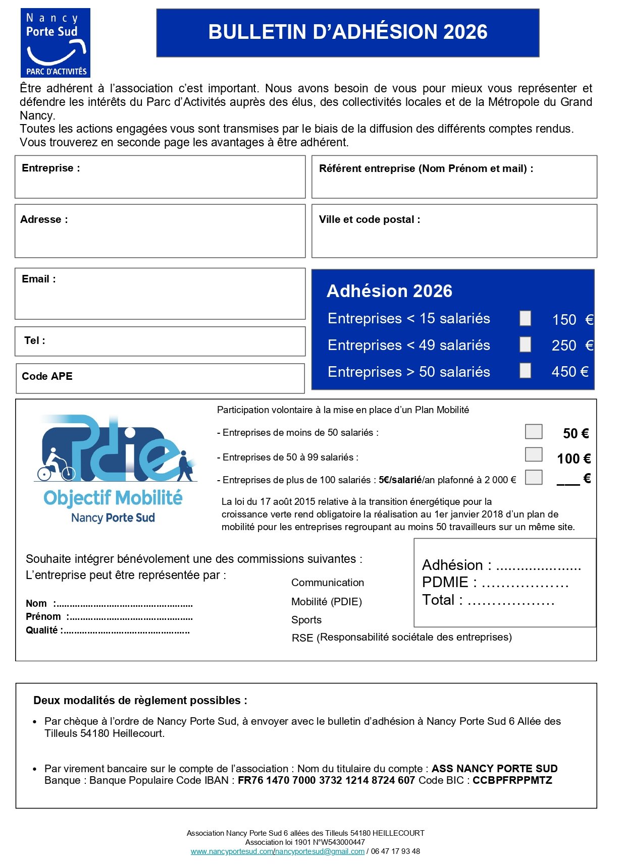 - Chèque à l'ordre de Nancy Porte Sud, à envoyer avec le bulletin d'adhésion à Nancy Porte Sud 6 Allée des Tilleuls 54180 Heillecourt.