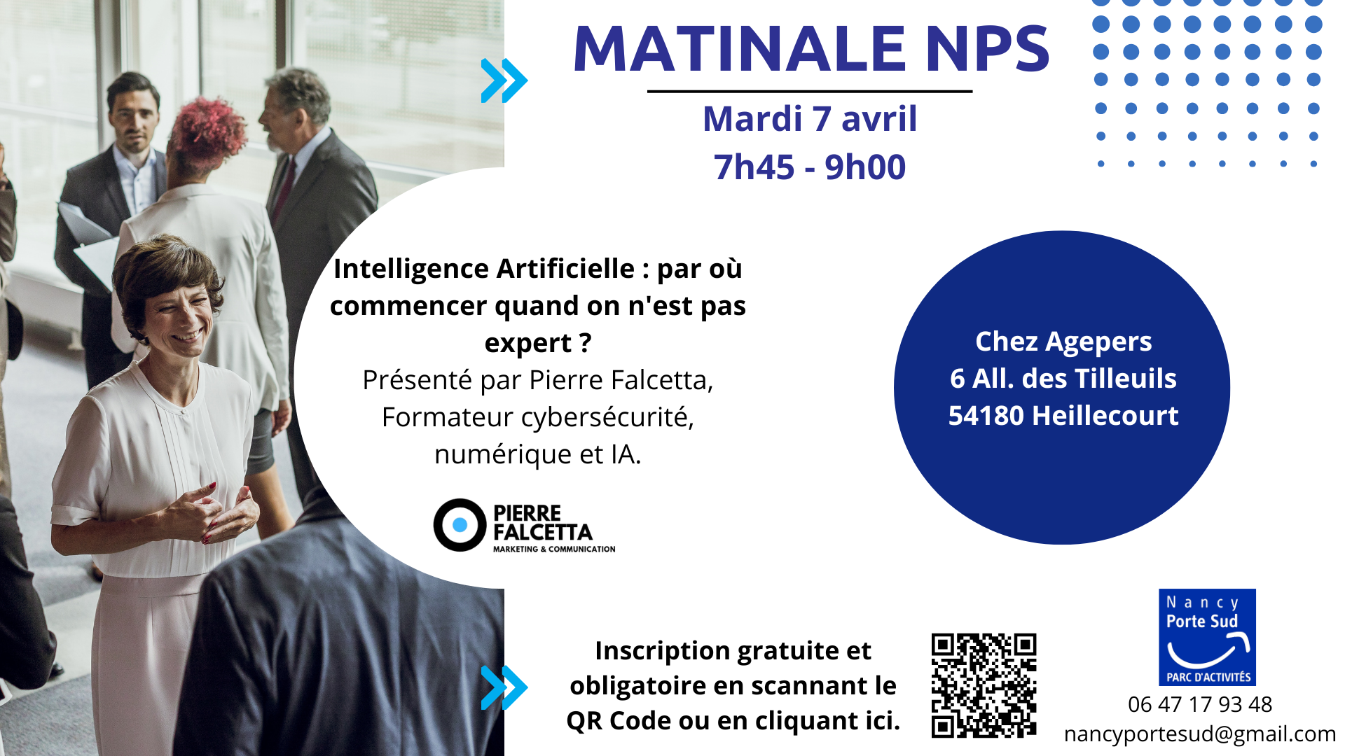 - 7 avril : chez Agepers sur la thématique : Intelligence Artificielle : par où commencer quand on n'est pas expert ? Présenté par Pierre Falcetta, Formateur cybersécurité, numérique et IA.